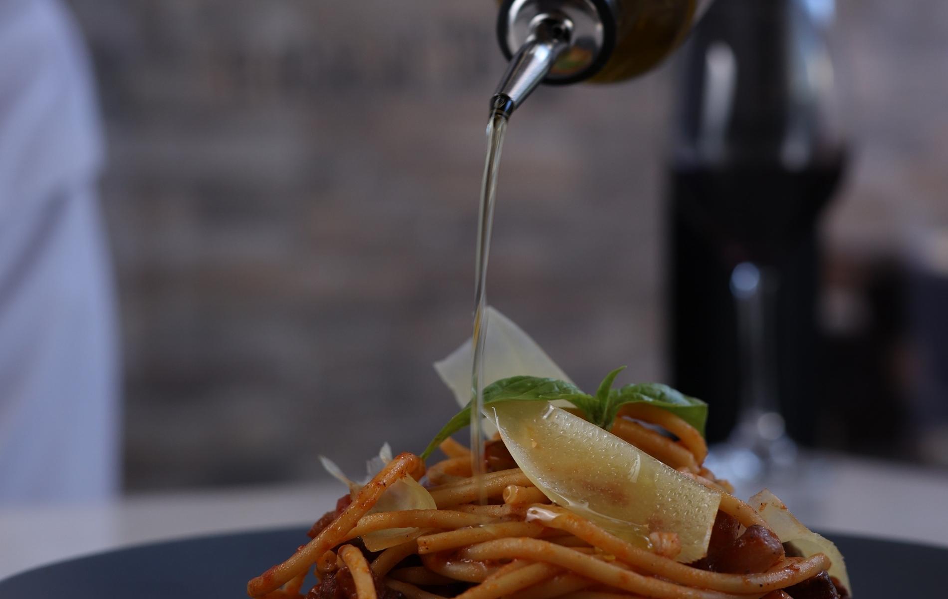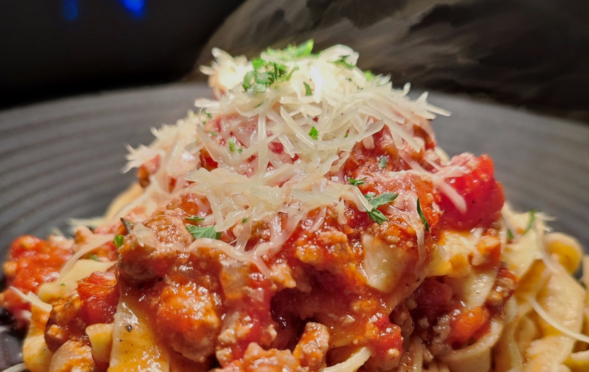 Tallarines anchos, ragú de carne en reducción de vino tinto, queso parmesano